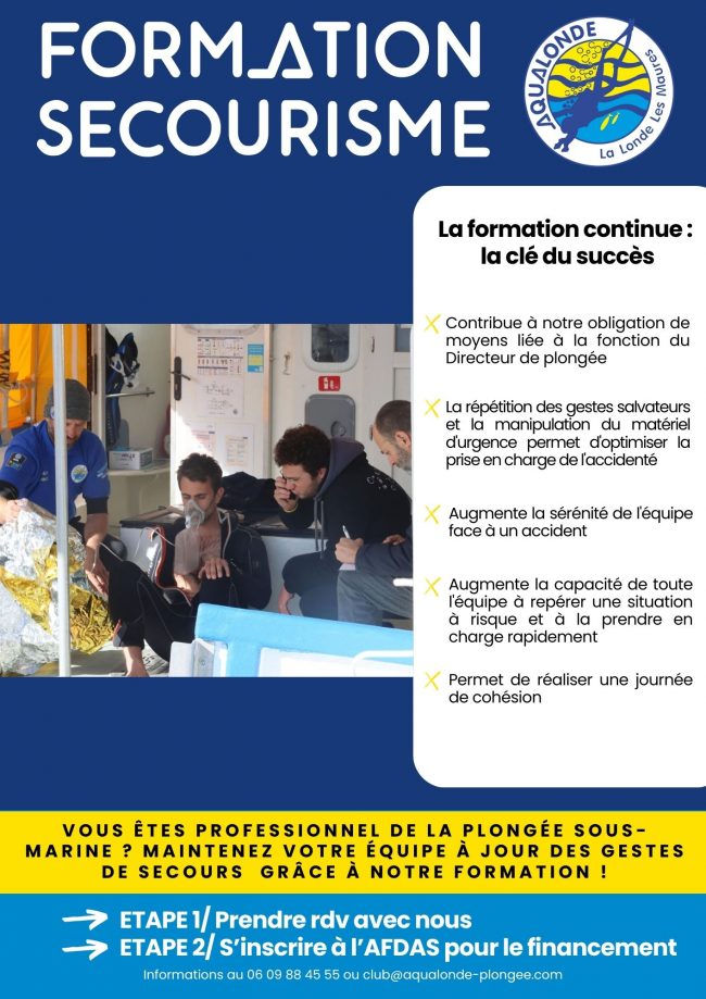 Formation secourisme pour directeurs de plongée : optimisez la prise en charge des accidentés et renforcez la confiance de votre équipe. Contactez nous ! 🌊🚑